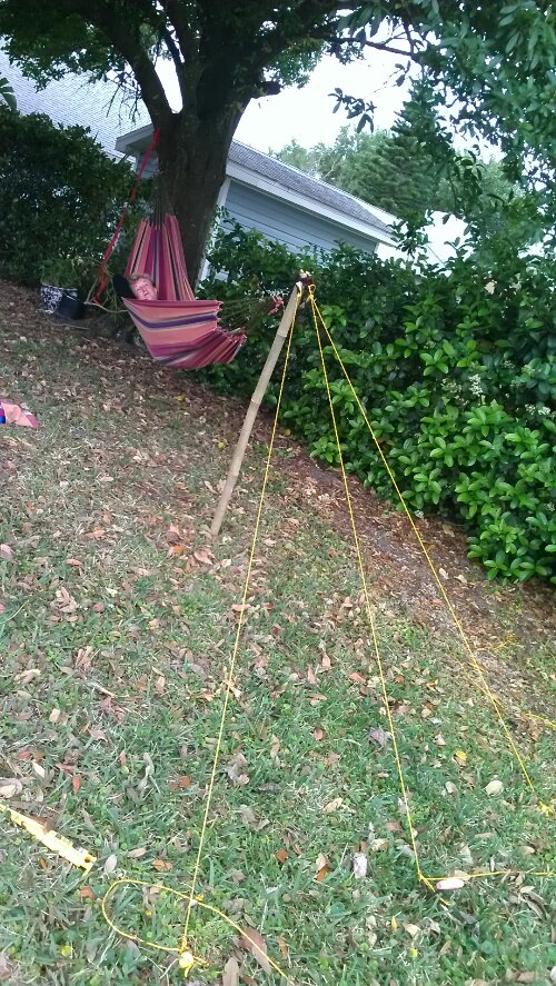 With the help of a freshly harvested piece of bamboo, a few two-half hitches, a couple of bowlines, a harness built with three alpine butterflies, and three 10 inch anchors (thanks the the sand bar that is Florida), we are in business!